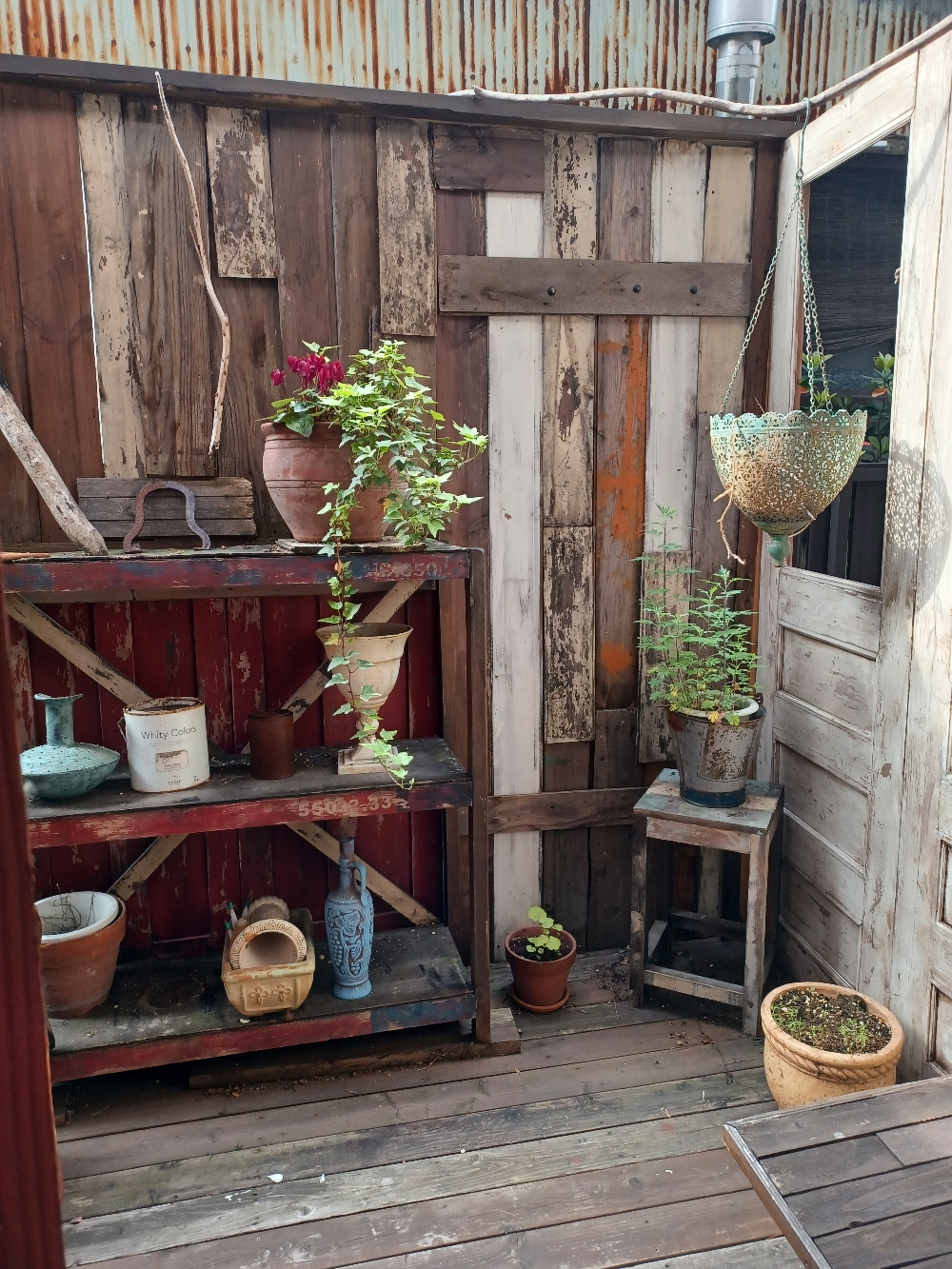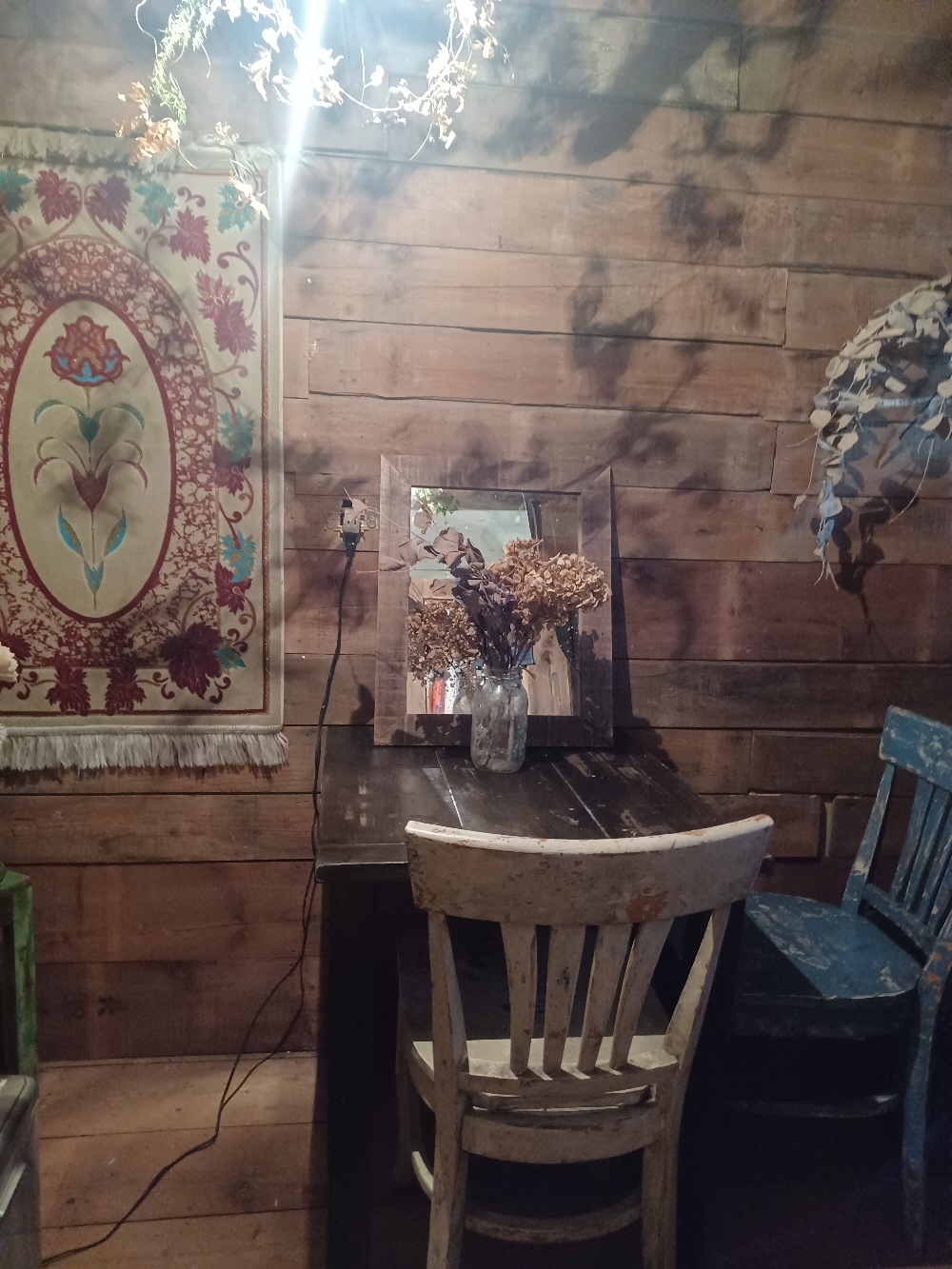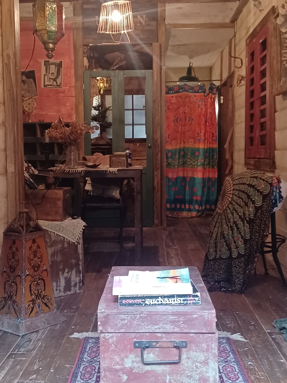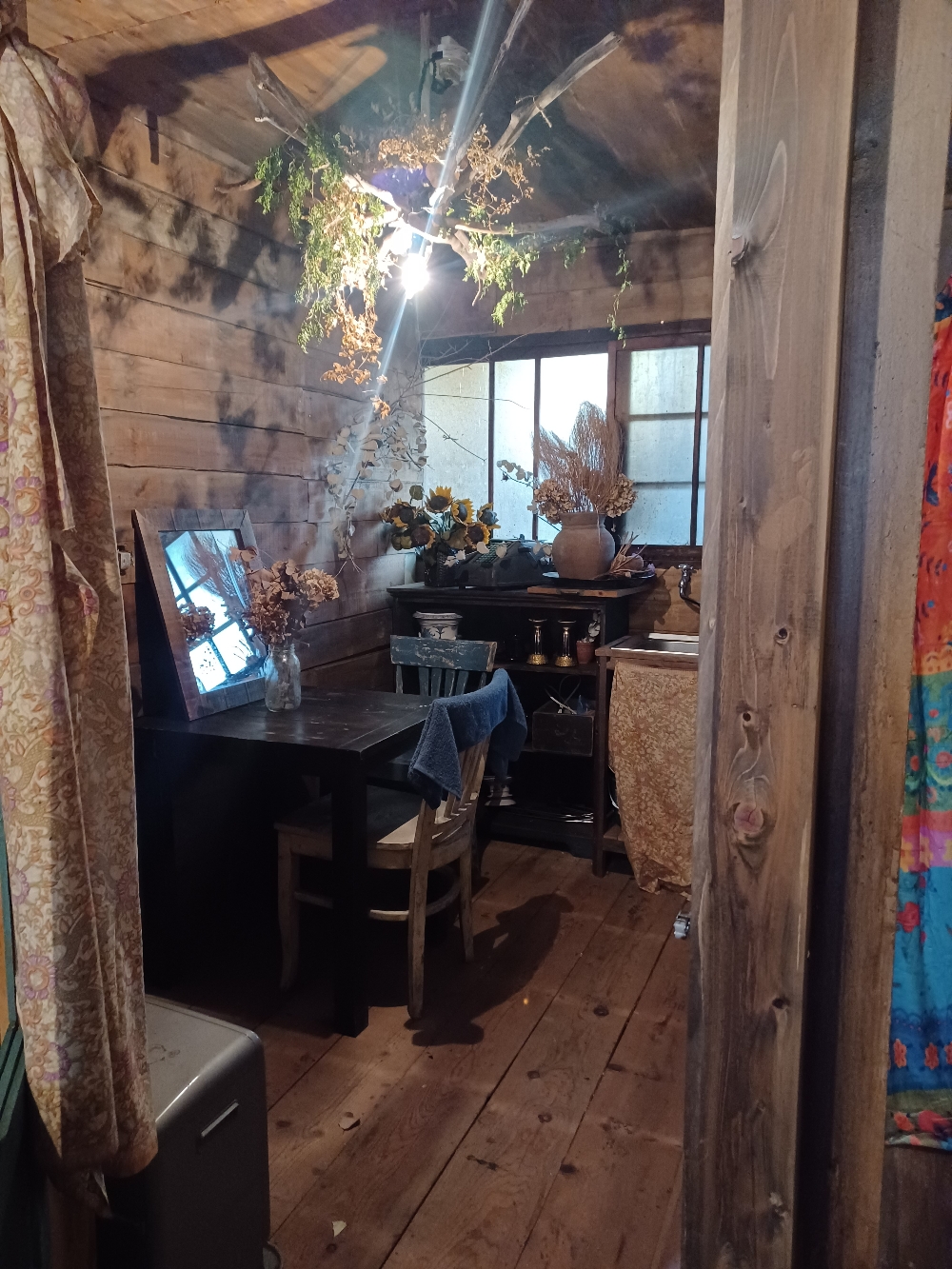 赤い扉が印象的な空間。扉を開けると2畳ほどのウッドデッキが広がります。中央にはデスクとチェアが配置され、グリーンとピンクの壁が目を惹くアクセントに。さらに手間のスペースは、古材の板張りで仕上げられた落ち着きのある空間。木の温もりに包まれながら、静かな時間を過ごせる場所になっています。