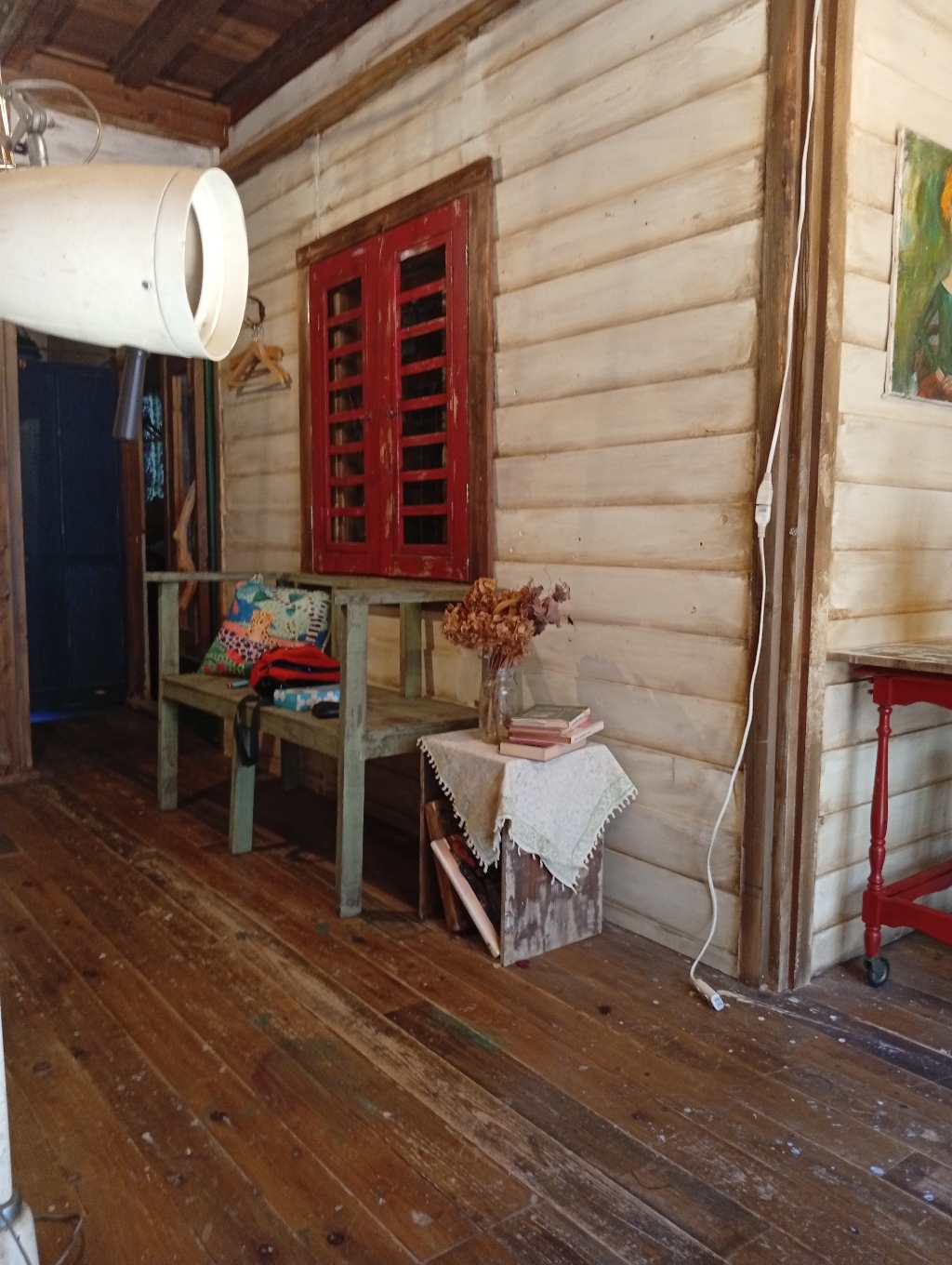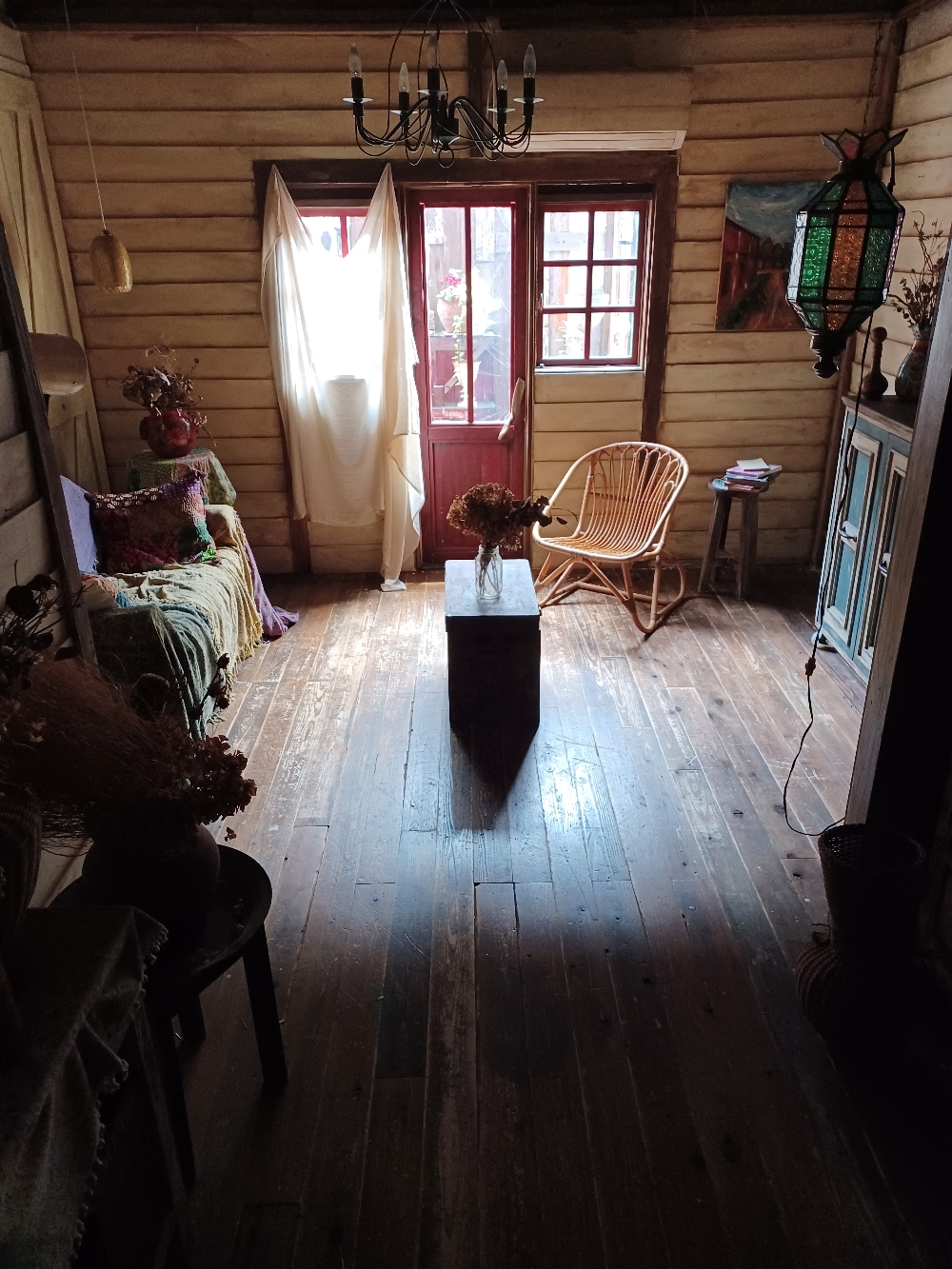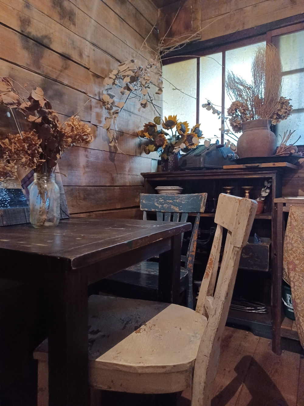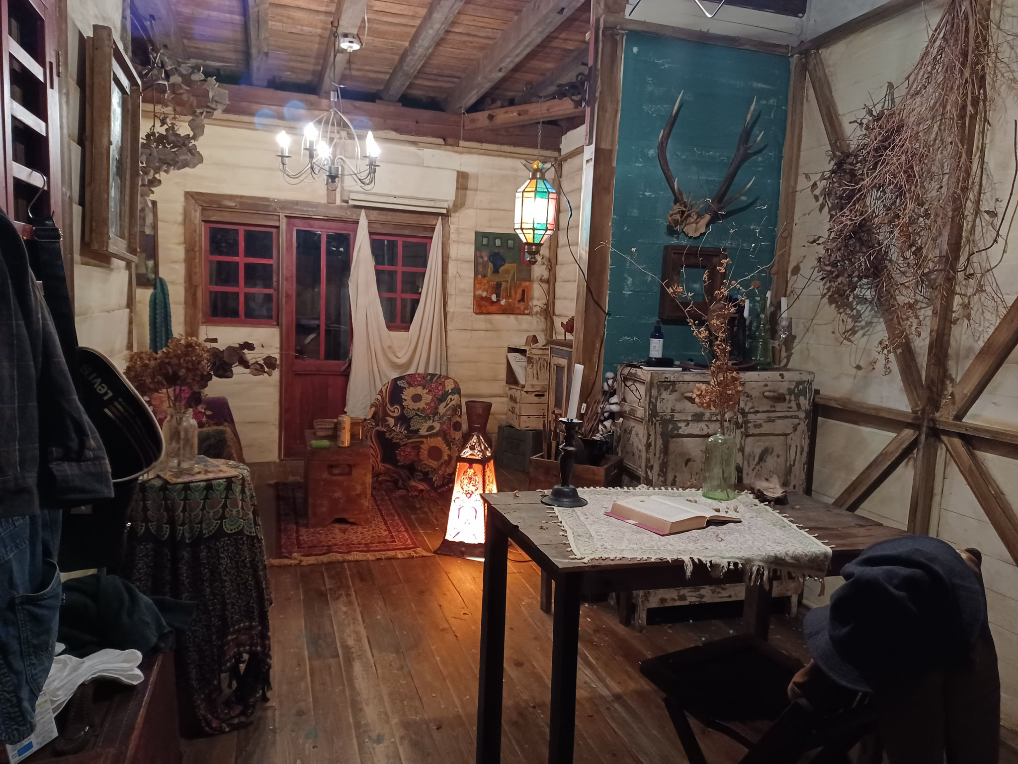 赤い扉が印象的な空間。扉を開けると2畳ほどのウッドデッキが広がります。中央にはデスクとチェアが配置され、グリーンとピンクの壁が目を惹くアクセントに。さらに手間のスペースは、古材の板張りで仕上げられた落ち着きのある空間。木の温もりに包まれながら、静かな時間を過ごせる場所になっています。