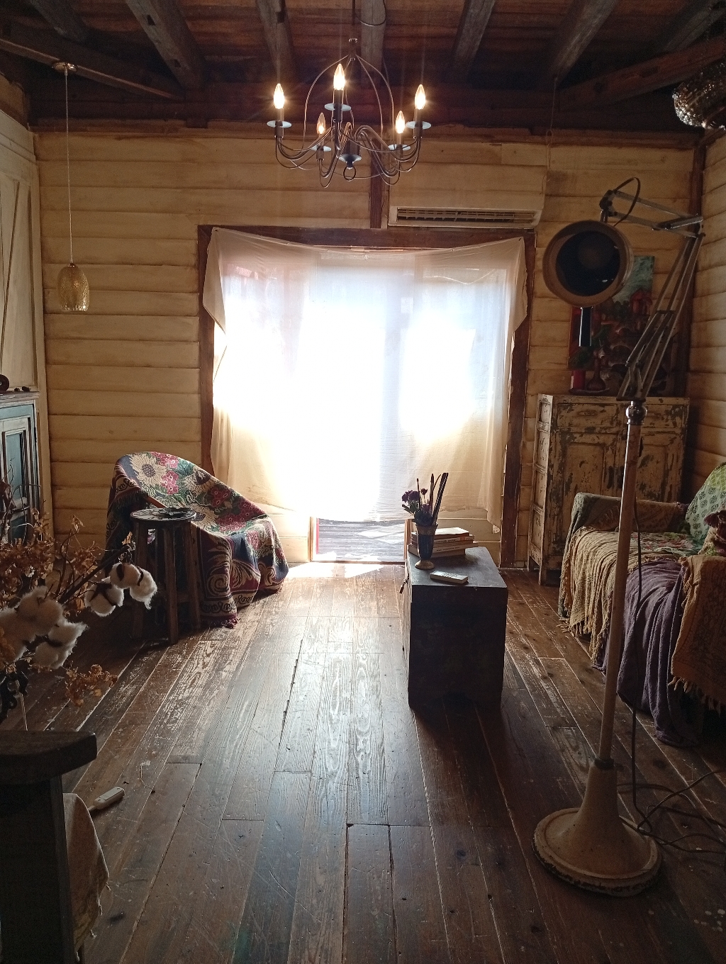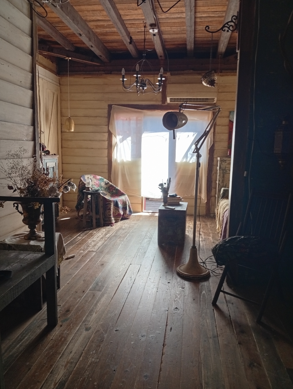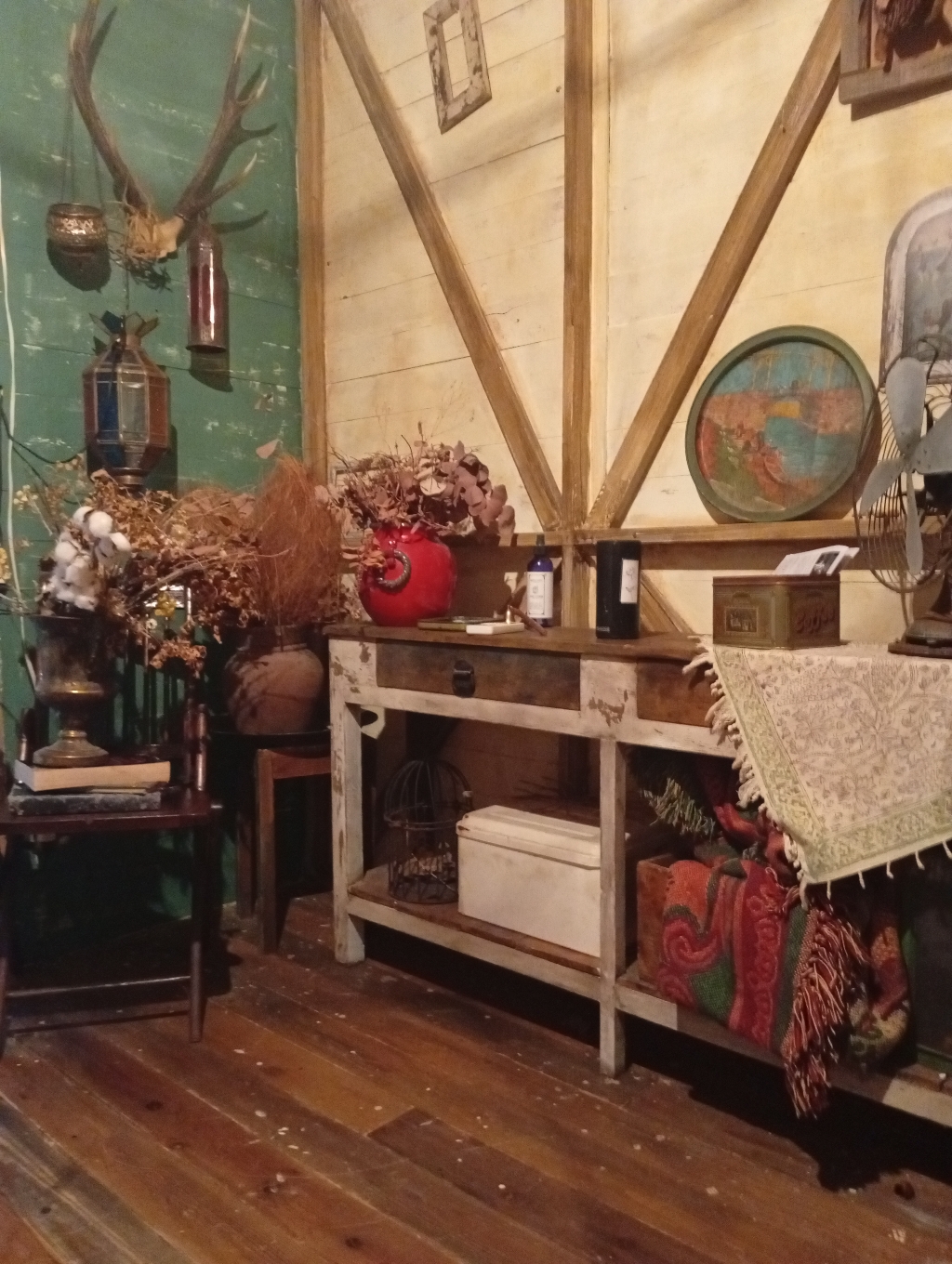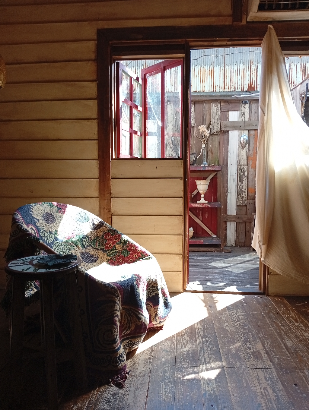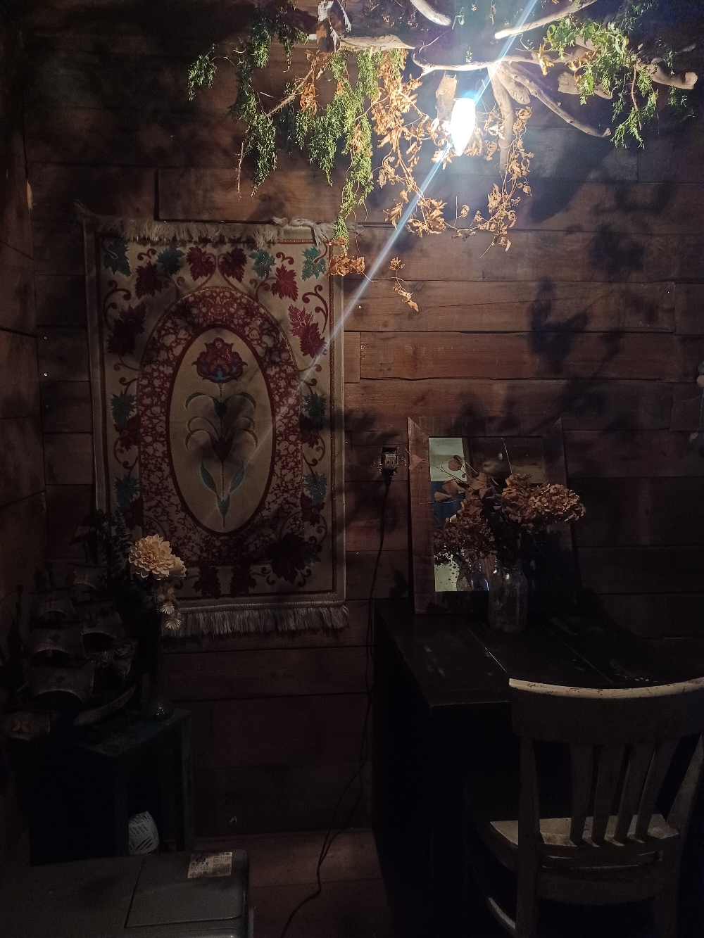赤い扉が印象的な空間。扉を開けると2畳ほどのウッドデッキが広がります。中央にはデスクとチェアが配置され、グリーンとピンクの壁が目を惹くアクセントに。さらに手間のスペースは、古材の板張りで仕上げられた落ち着きのある空間。木の温もりに包まれながら、静かな時間を過ごせる場所になっています。