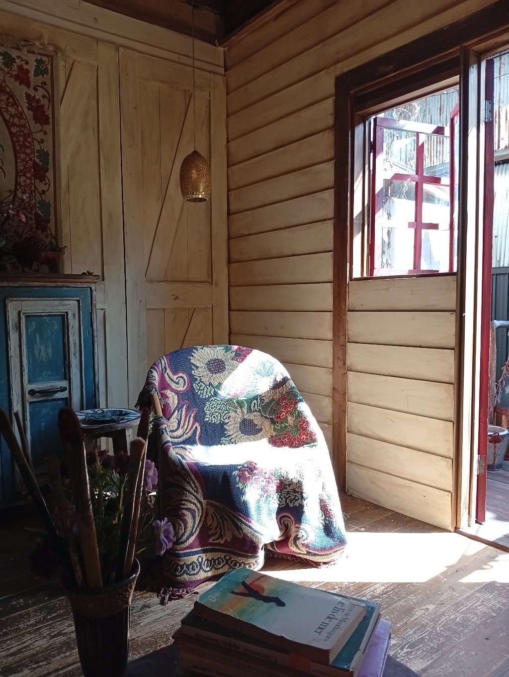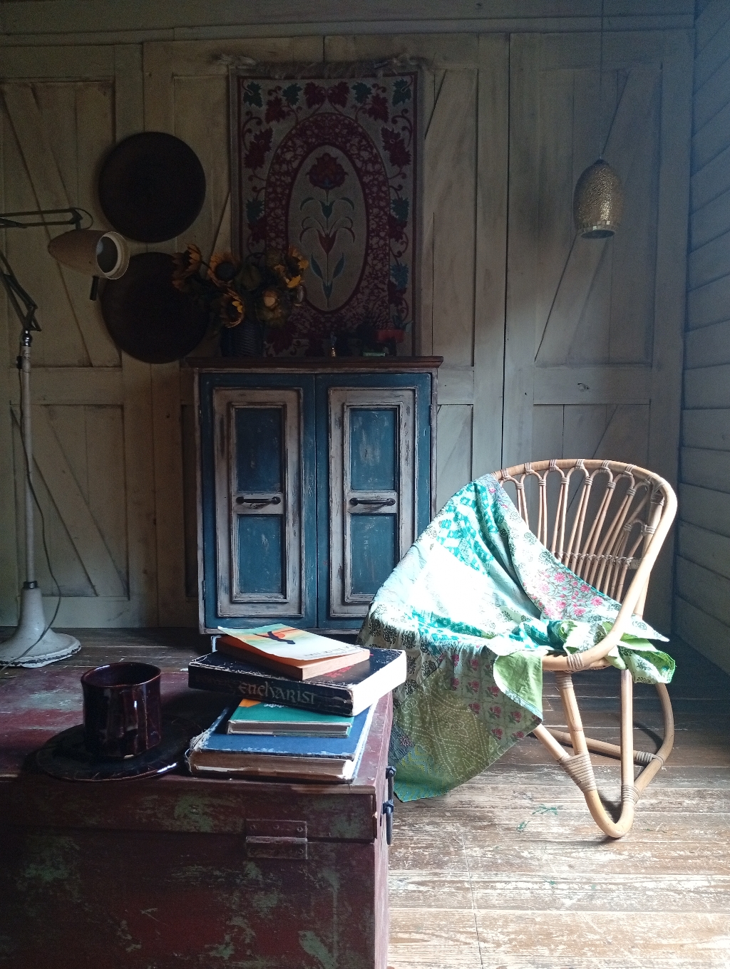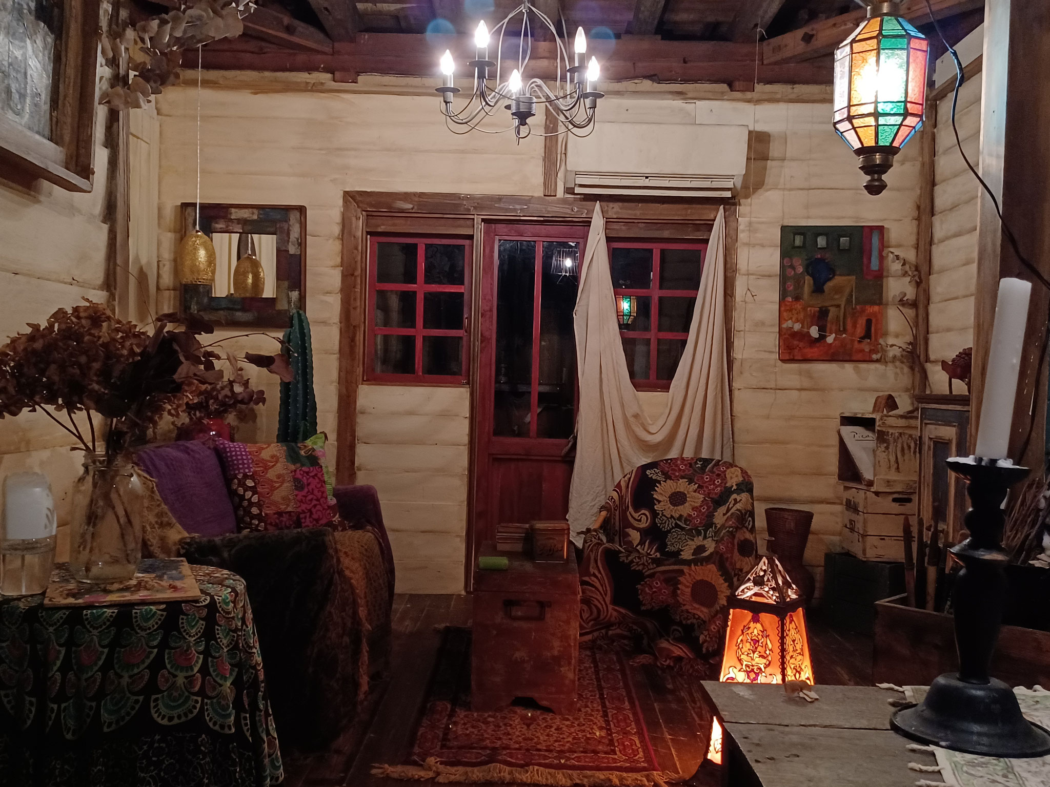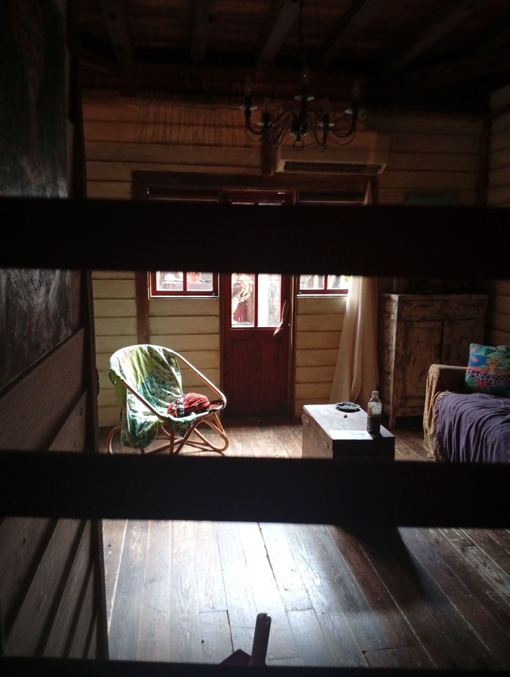 赤い扉が印象的な空間。扉を開けると2畳ほどのウッドデッキが広がります。中央にはデスクとチェアが配置され、グリーンとピンクの壁が目を惹くアクセントに。さらに手間のスペースは、古材の板張りで仕上げられた落ち着きのある空間。木の温もりに包まれながら、静かな時間を過ごせる場所になっています。