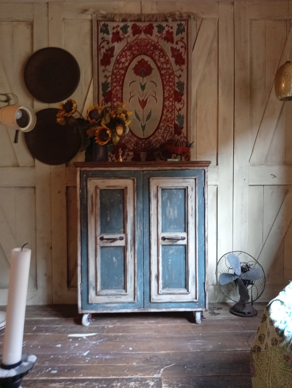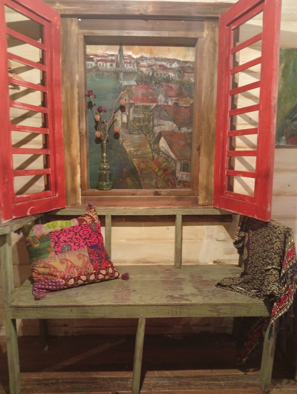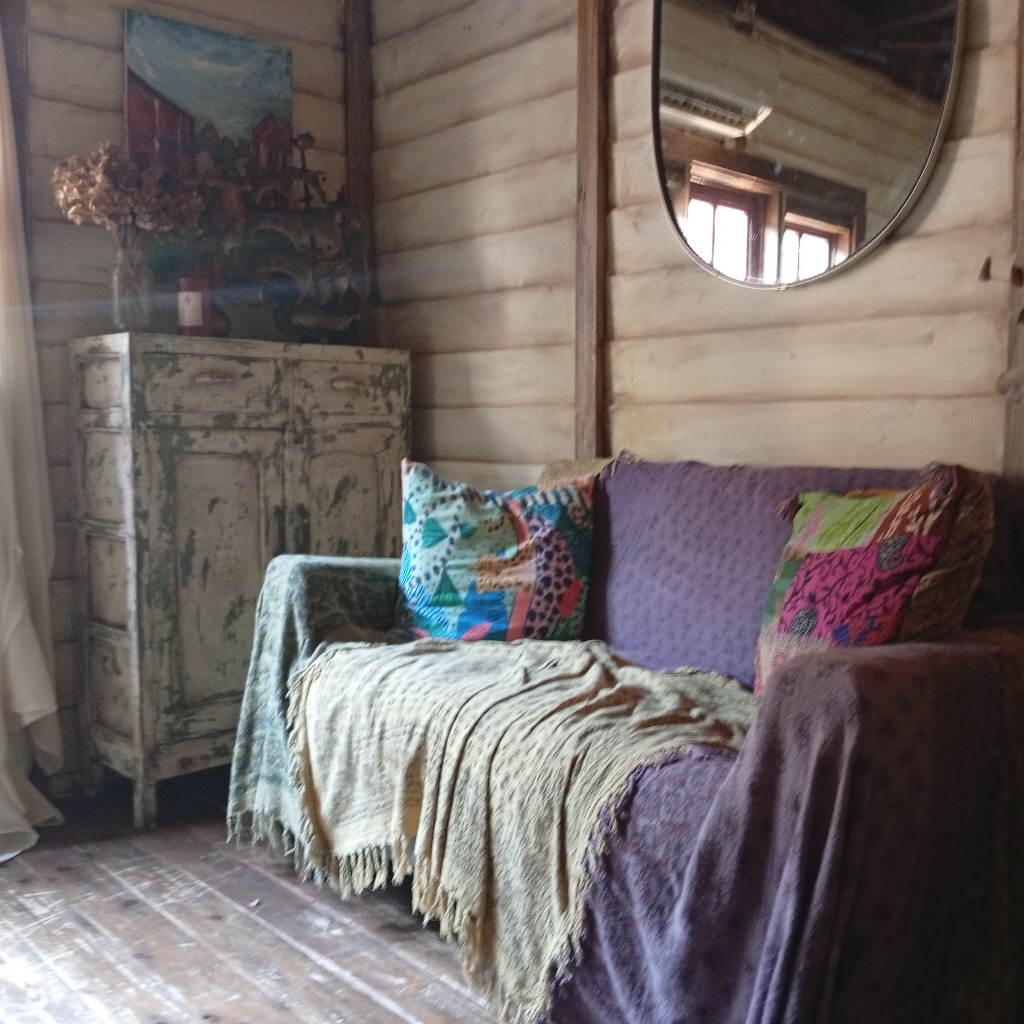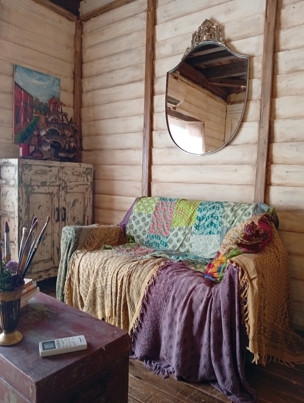 赤い扉が印象的な空間。扉を開けると2畳ほどのウッドデッキが広がります。中央にはデスクとチェアが配置され、グリーンとピンクの壁が目を惹くアクセントに。さらに手間のスペースは、古材の板張りで仕上げられた落ち着きのある空間。木の温もりに包まれながら、静かな時間を過ごせる場所になっています。